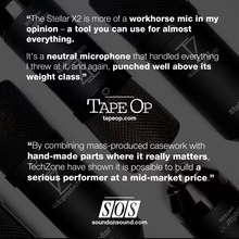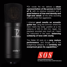 Most low-cost condenser microphones have a noticeable harsh and bright tone that makes them hard to sit in a mix and can sound fatiguing over time. The Stellar X2 is different in that we carefully tuned its capsule and circuit to produce a sound that is very smooth and easily sits in any mix without the tinny harshness of low-cost condenser microphones.